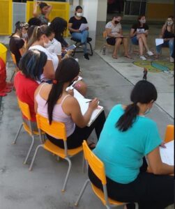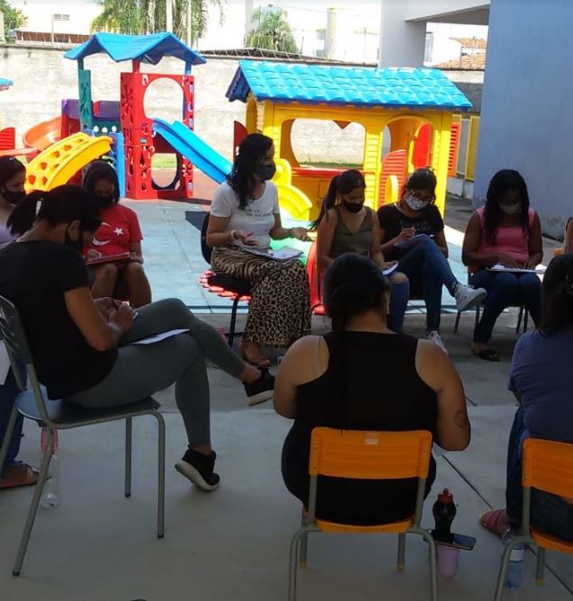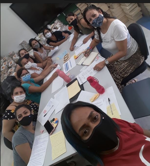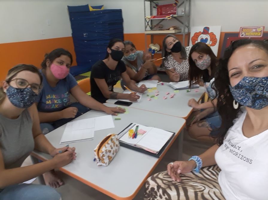 Com a premissa de que “juntos podemos mais”, a coordenadora Ariane desenvolveu uma atividade de “Brainstorming” com a equipe, que visa à partilha das ideias e sugestões de jogos e brincadeiras.