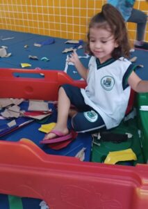 As crianças da unidade escolar de Pindamonhangaba, CMEI Professora Therezinha Macedo Pedro de Andrade, brincaram com diferentes tipos de papéis, puderam manipular e rasgar. Usaram a imaginação para criar histórias e jogaram os papéis para cima.