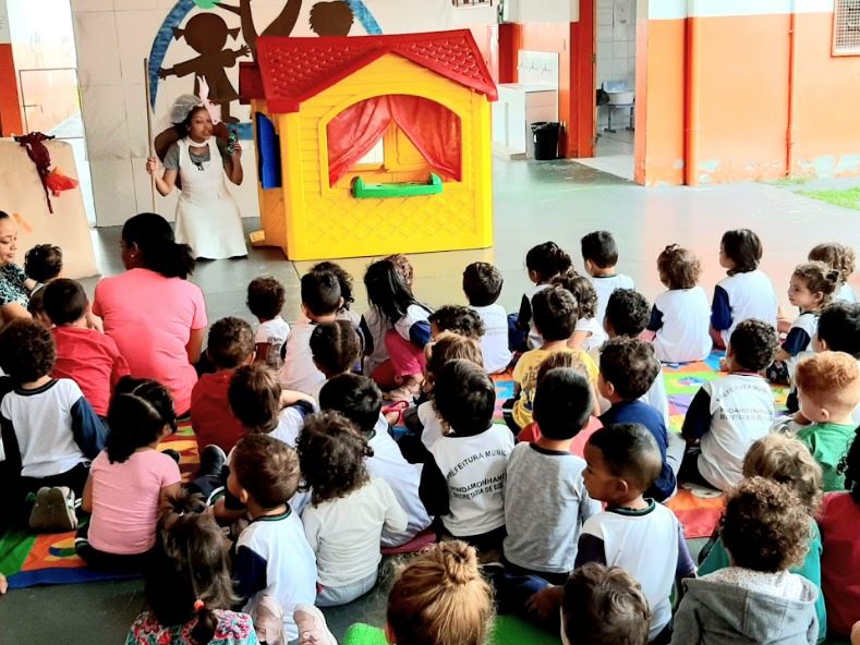 As crianças da unidade escolar de Pindamonhangaba CMEI Yolanda Immediato Fryling se divertem com as brincadeiras cantadas realizadas pelas educadoras.